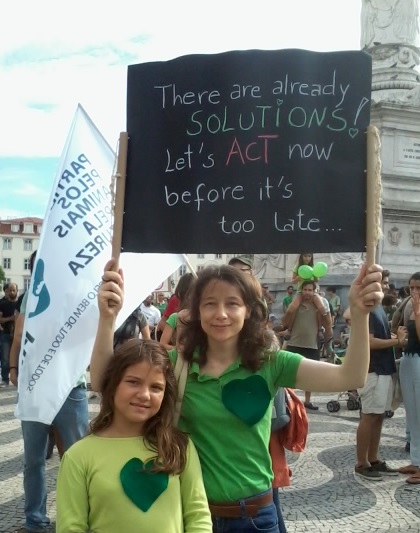 Manifestante Raquel e a sobrinha1Com os pés na terra, a cidadã Raquel Cabrita (foto), e sua sobrinha Maria Beatriz, exibia o cartaz para dizer que as soluções já existem e que é necessário agir agora antes que seja tarde demais. Raquel vive em Oeiras, na grande Lisboa, Portugal, e assinou a petição entregue ao secretário-geral das Nações Unidas pela  ONG Avaaz. Segundo Raquel, o que a motivou a assinar a petição e a participar da mobilização é a preocupação com as futuras gerações e porque as consequências das alterações climáticas estão às claras.