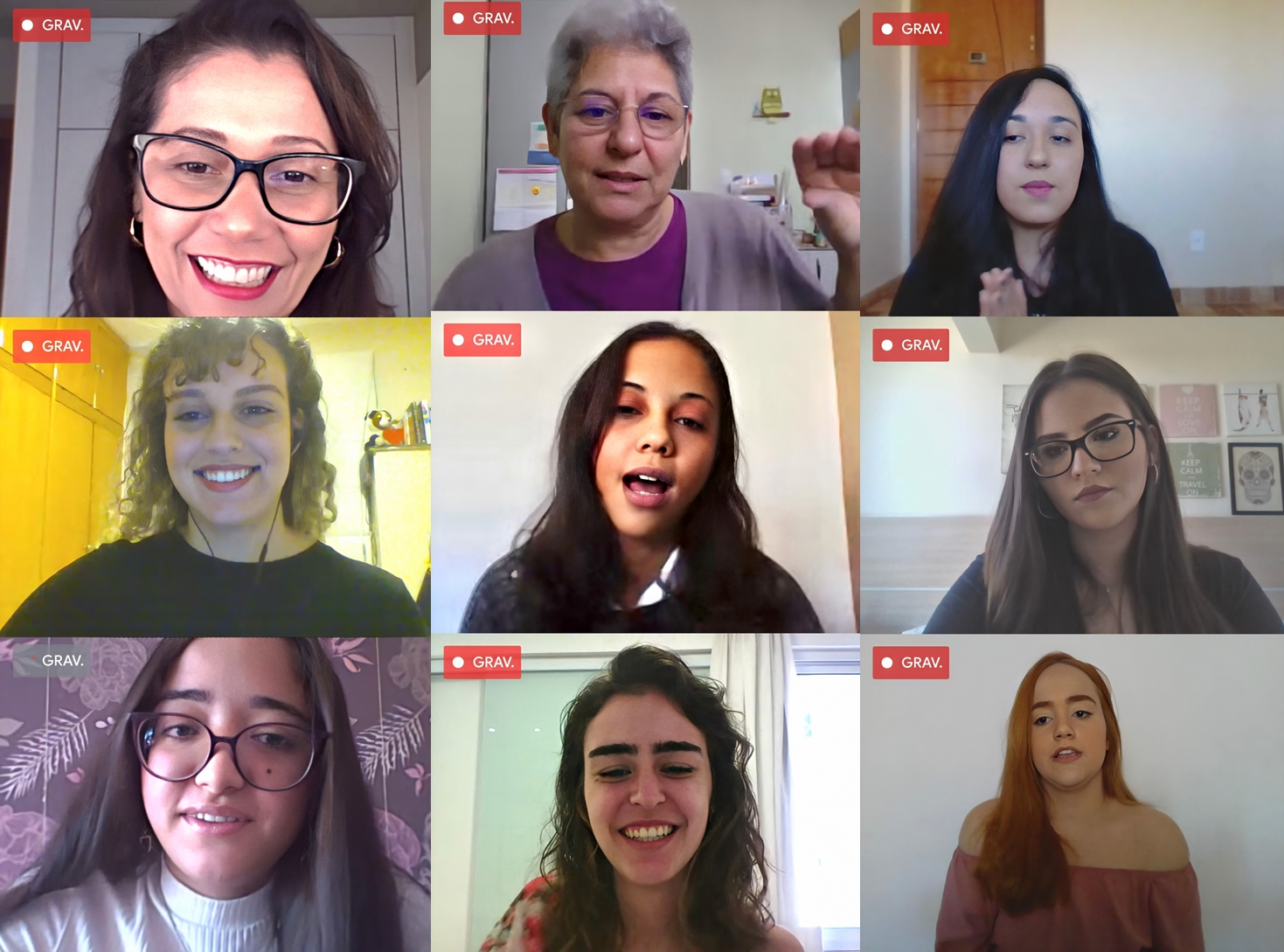 É desse modo que a convidada especial, Sandra Araújo, inicia sua palestra. A professora e escritora que é mestra em Teoria Literária e Doutora em Literaturas de Língua Portuguesa, falou de suas impressões sobre o livro-reportagem levando em consideração a atual situação em decorrência do novo coronavírus. “Foi um ato de extrema coragem escrever em um momento em que todo mundo está fragilizado diante das incertezas que a pandemia veio trazer. O livro materializa o que queriam dizer sobre a pandemia, mas a obra eternizou a palavra de vocês em uma época tão difícil e vemos a maturidade com que escreveram no resultado”, afirma a professora e escritora Sandra (foto, alto à esquerda).